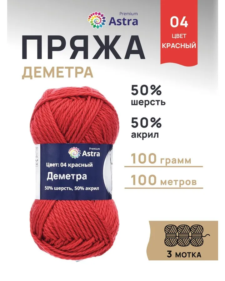 Пряжа Astra Premium Эвридика шерстяная 100 г 200 м 09 красный 3 мотка
