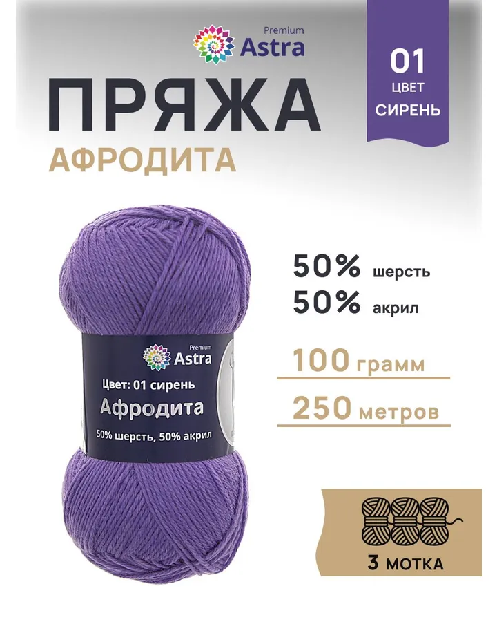 Пряжа Astra Premium Эвридика шерстяная 100 г 200 м 16 сирень 3 мотка