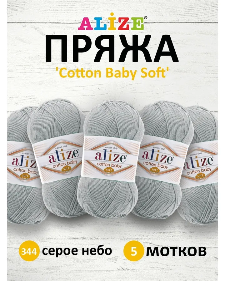 Пряжа для вязания Alize cotton baby soft 100 гр 270 м мягкая плюшевая xлопок aкрил 344 серое небо 5 мотков