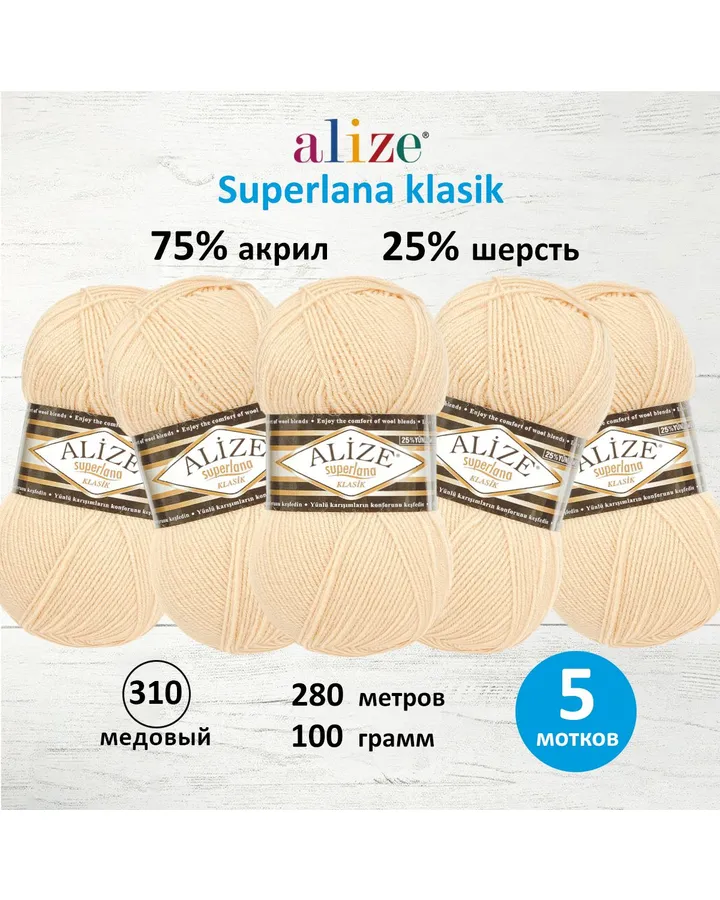 Пряжа Alize теплая для вязания шарфов шапок Superlana klasik 100г 280 м 5 мотков 310 медовый