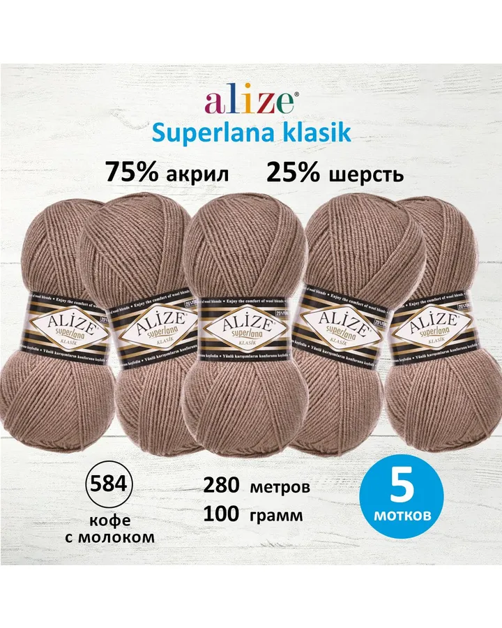 Пряжа Alize для вязания шарфов шапок Superlana klasik 100г 280 м 5 мотков 584 кофе с молоком