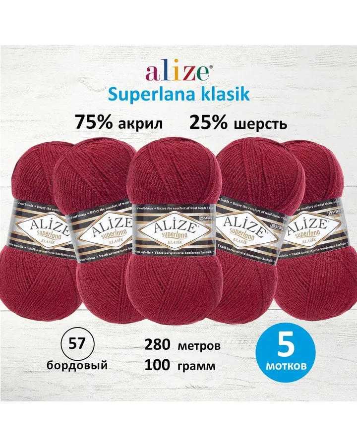 Пряжа Alize для вязания шарфов шапок Superlana klasik 100 гр 280 м 5 мотков 57 бордовый
