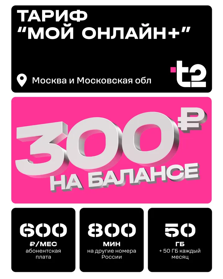 Sim-карта t2, тариф "Мой онлайн+", баланс - 300 рублей