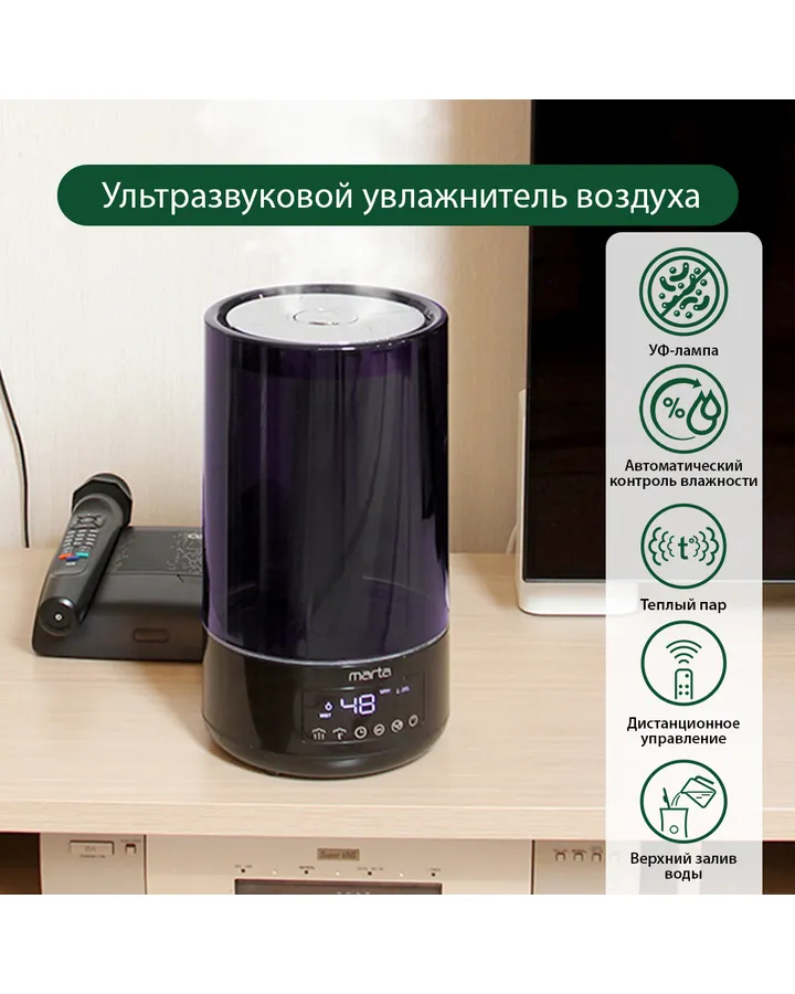 5Увлажнитель воздуха ультразвуковой MARTA MT-2693 черный жемчуг верхний заливбесшумный , угольный фильтр