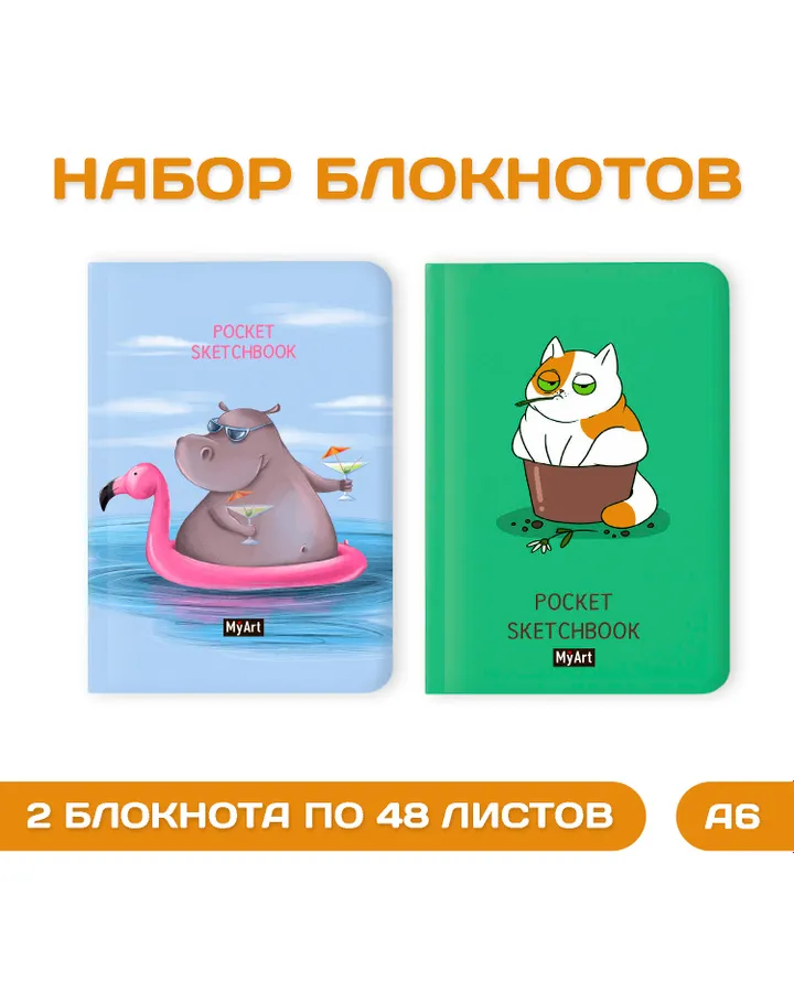 Блокнот Проф-Пресс Pocket скетчбук от MyArt 104х146 мм 48 листов. В наборе 2 шт Бегемот+Кот