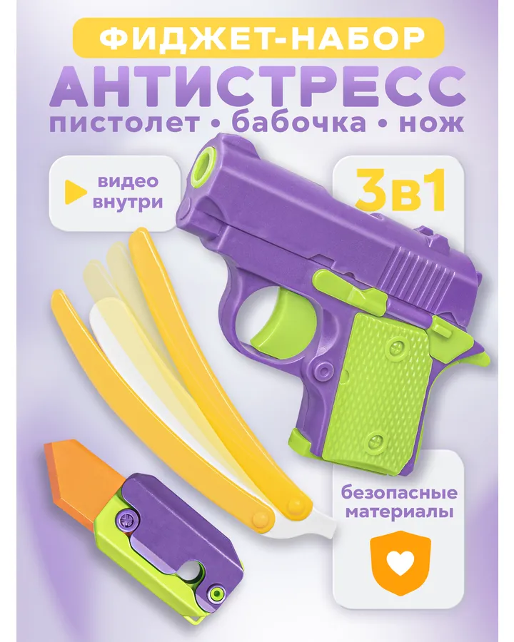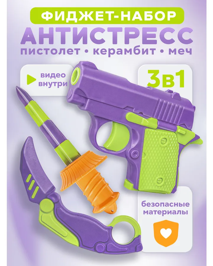 Фиджет BAZUMI Антистресс пистолет игрушкаОтличный набор для активных мальчишек! Всё сделано из безопасного пластика, никаких острых краёв. Пистолет стреляет с характерным щелчком, нож удобно крутить в руках. Сыну 6 лет очень понравилось!