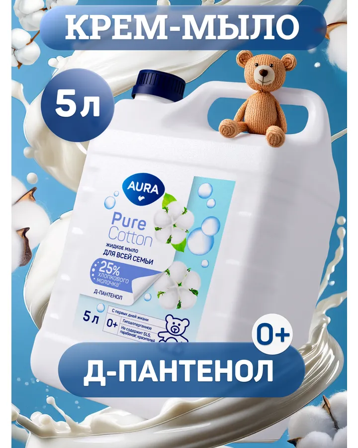 Мыло жидкое AURA Олива и хлопковое молочко 5000 млПриятный запах, нежная текстура, отлично пениться и легко смывается, экономичный рассход