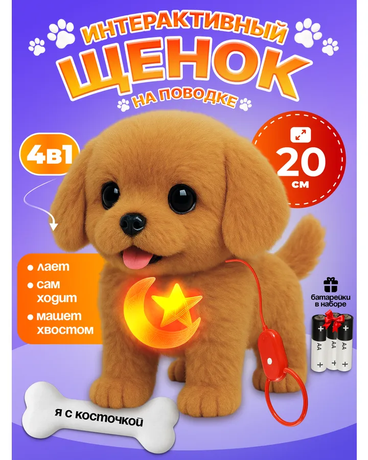 Мягкая игрушка FAVORITSTAR DESIGN собачка ТяфИнтерактивная собачка стала настоящей любимицей в нашем доме! Ребенок в восторге - каждый день играет с ней, смеется и радуется. Собачка забавно ходит, лает, словно настоящая. Очень понравилось высокое качество исполнения: ни одного дефекта, все работает без нареканий. Особенно хочетсы отметить приятный на ощупь мех - мягкий, нежный, не лезет. Отличная игрушка для малышей, рекомендую к покупке!