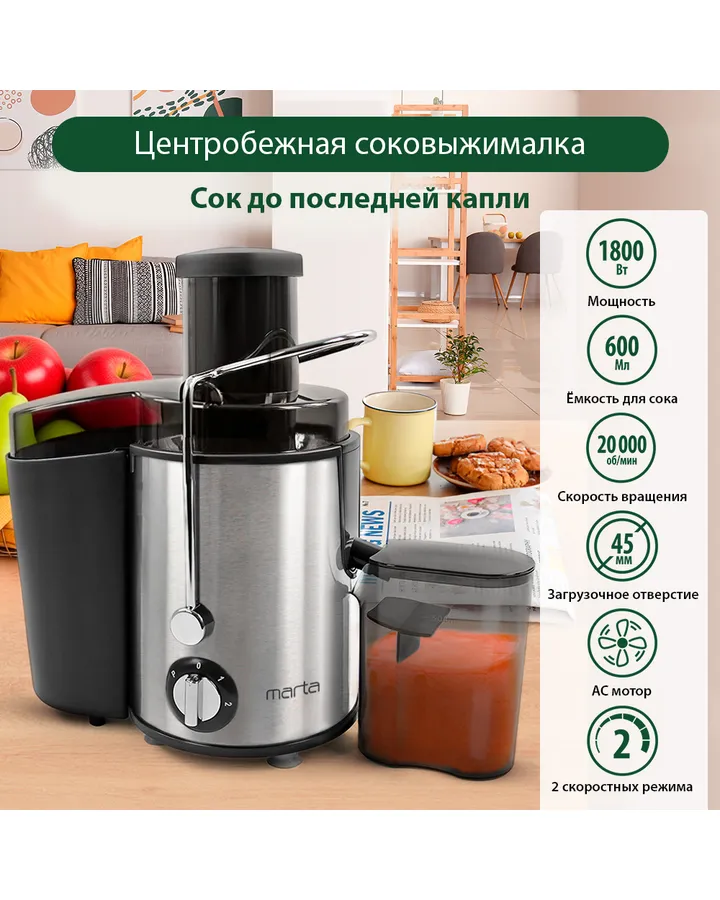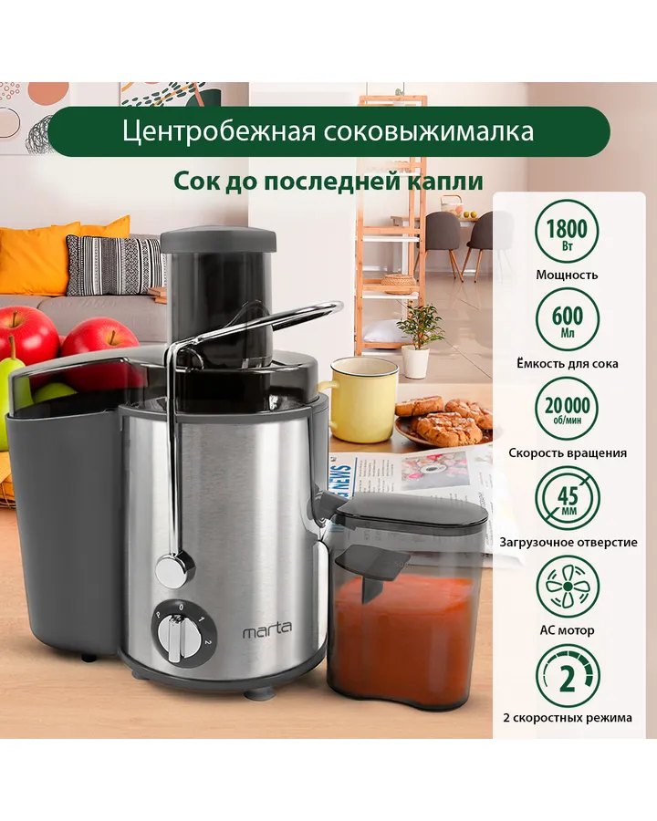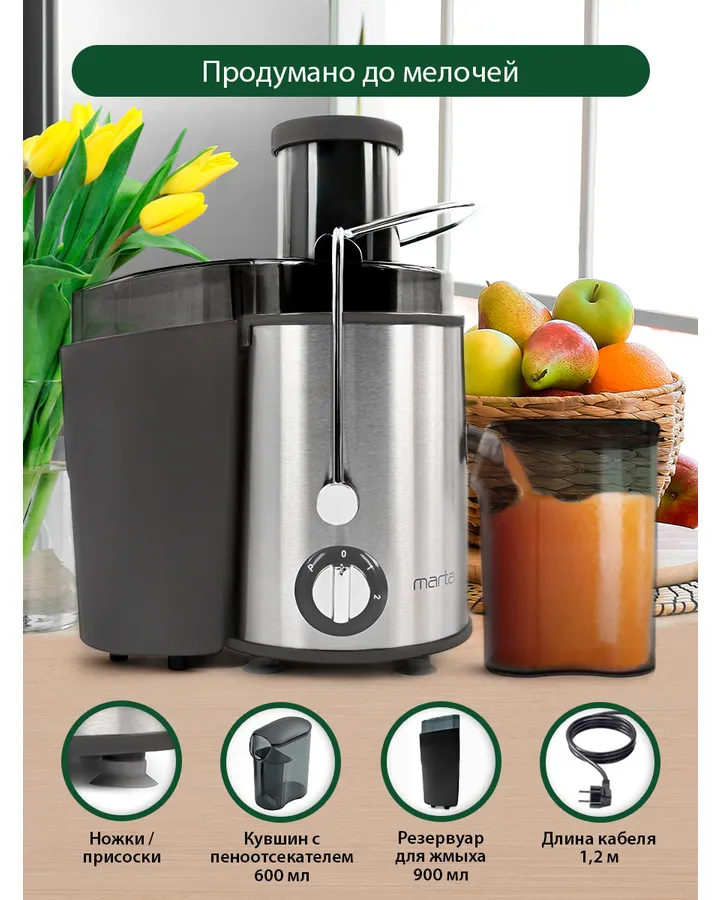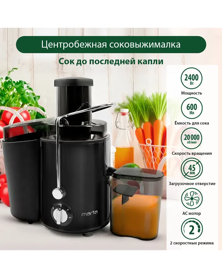 5Соковыжималка MARTA MT-2049 черный жемчугХорошо работает, легко моется, проста в сборке и использовании