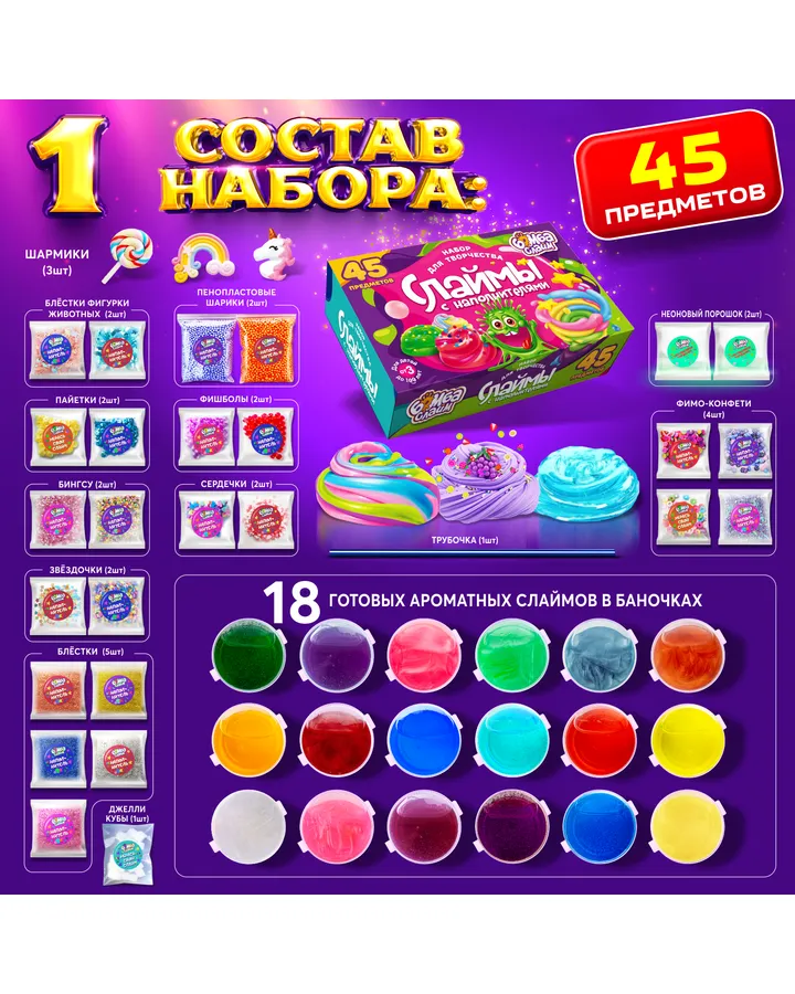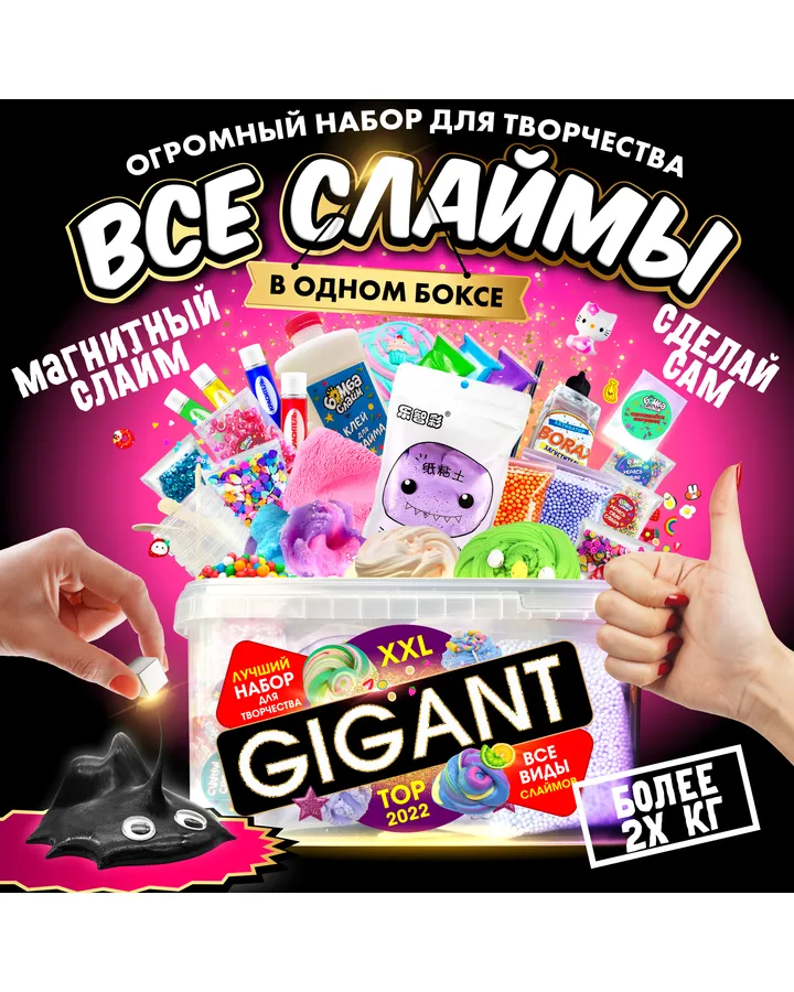 Отличный набор слаймов. В комплекте баночки. Ребенок смешал и сделал все в обычном пищевом контейнере с крышкой. Восторг. К рукам ничего не липнет. Товаром довольны