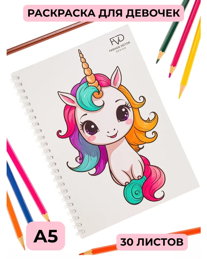 Раскраска для детей Fashion Vector Design Единороги, Принцессы, Феи, 30 листов, А5, подарок девочкам