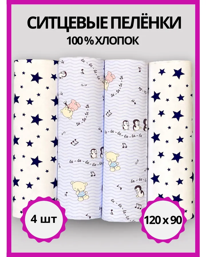 Пелёнка Делоникс Звезды + Голубые Нотки ситец 90х120 см 4 шт.