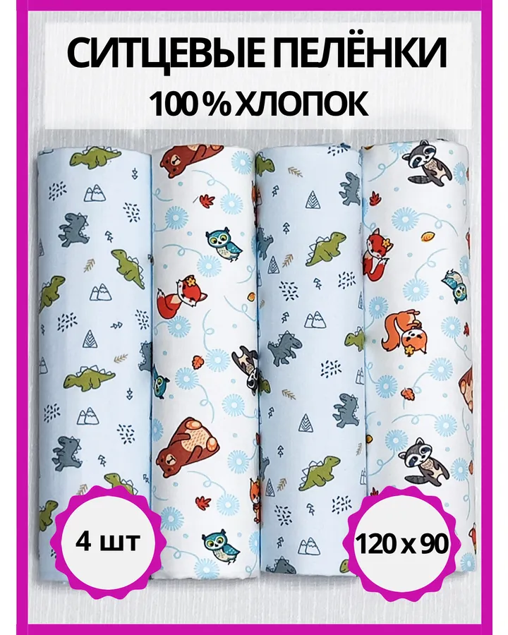 Пелёнка Делоникс Еноты + Бирюзовые Динозавры ситец 90х120 см 4 шт.