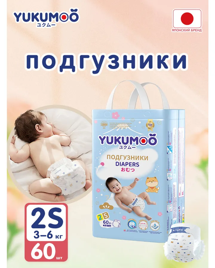 Подгузники YUKUMOO для новорожденных S (3-6 кг) 60 шт.
