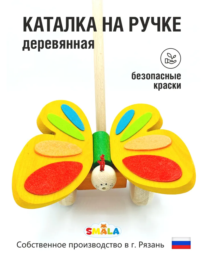 Игрушка S-mala каталка БабочкаНеобычная каталка , яркая , привлекает внимание ребёнка . Крылышки двигаются когда крутятся колёса .