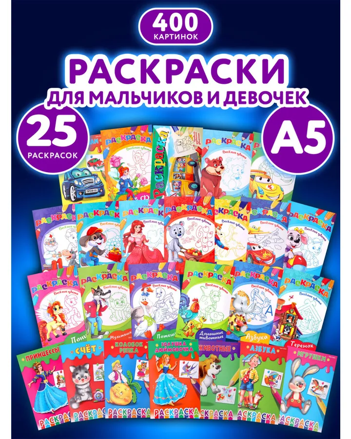 Раскраски детские Prof-Press набор Для девочек и мальчиков А5 25 штук