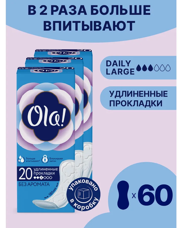 Ежедневные прокладки Ola! удлиненные без аромата 60 шт 3 уп по 20 шт