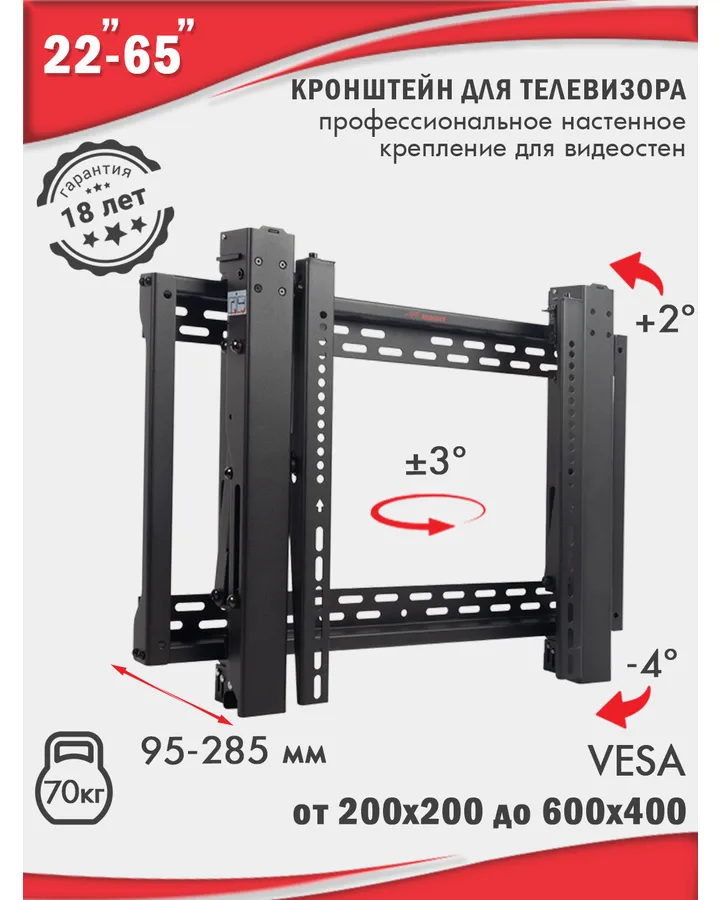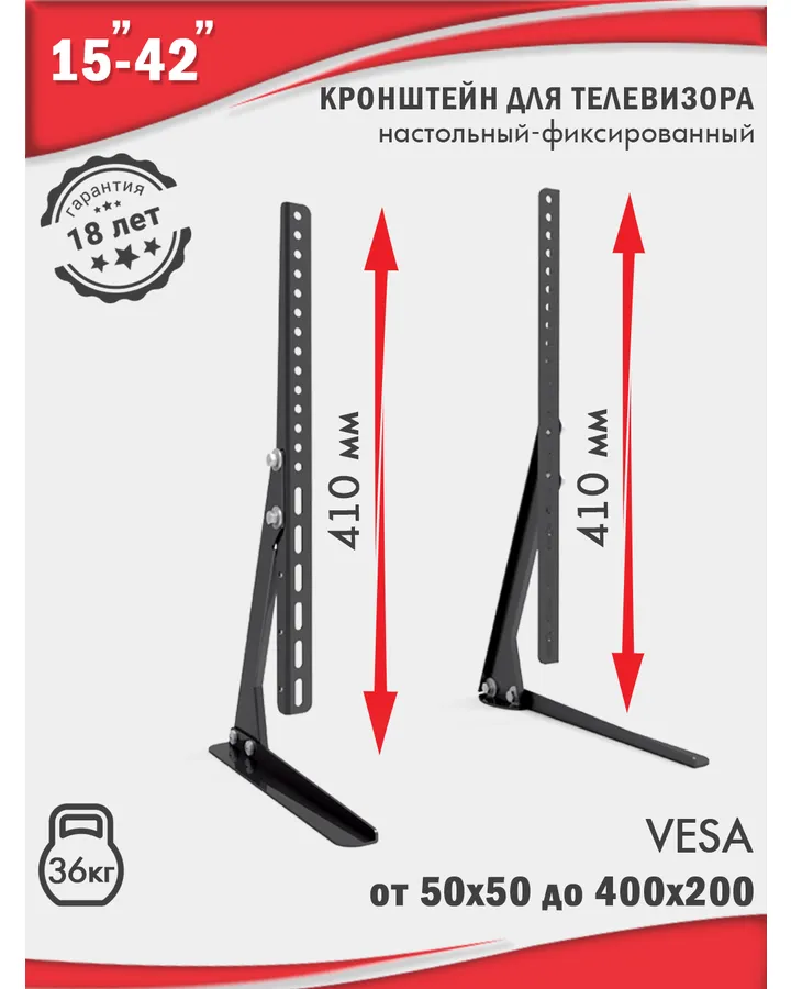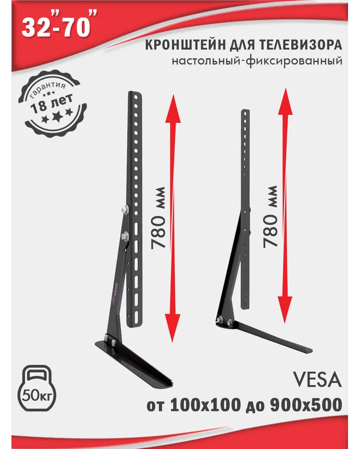 5Кронштейн для телевизоров ABC Mount STAND-02Металл достаточно толстый, не гнётся под нагрузкой большого телевизора, а у нас это 65" (165 см) Телевизор LED Toshiba 65C350KW. Весит 16,4 кг, можете сами проверить, если хотите, в интернете к этой модели телевизора прописаны все его характеристики и все они прекрасно сочетаются с этой подставкой, телек стоит устойчиво, подставка - 👍🏻 Вместо десятков слов. Заказывал недавно, привезли спустя один день, но я заказывал с доставкой на дом и готов был немного подождать, а если оформлять на пункт выдачи или с самовывозом из магазина, то забрать можно было бы уже на следующий же день. Товаром абсолютно доволен, удачно выбрал, комплектация полная, дефектов не увидел, отличная, неброская подставка, советую!
