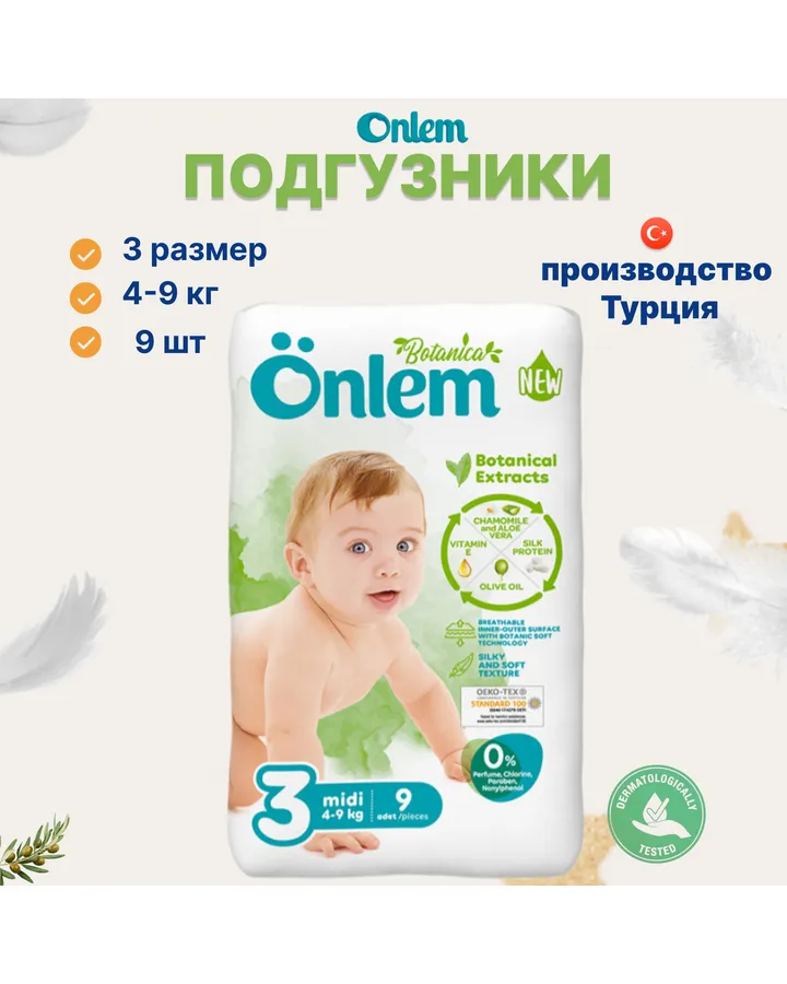 Подгузники Onlem для новорожденных 3 (4-9 кг) 9 шт.Намного лучше голубых Onlem - ultra comfort & dry system: эти меньше протекают, не пахнут духами, приятнее на ощупь, однако натиск дешевизны присутствует - они тоже плохо впитывают, что не мудрено, если учитывать их внутренний вид.