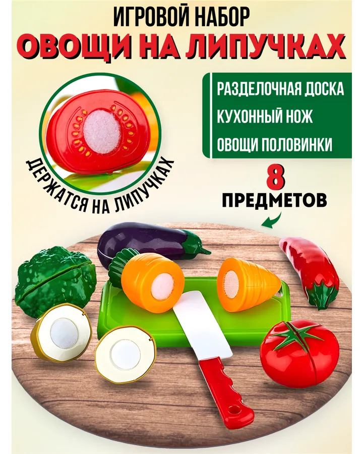 Яркие и прочные овощи. Ножик послабее, не знаю насколько его хватит) Липучки тугие, ножом малышке тяжело резать, больше разламывает руками. В целом хороший набор. Брали в доп к кухне.