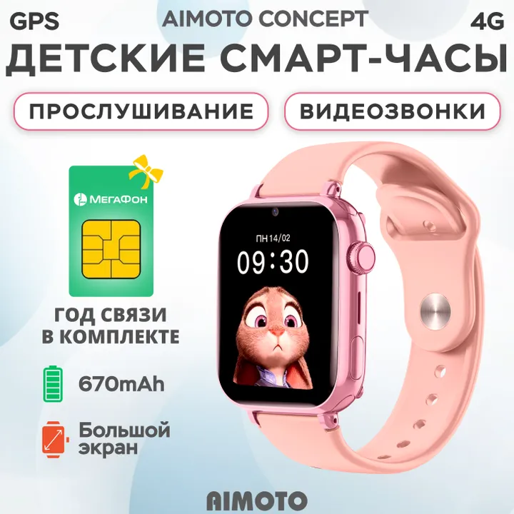 Детские смарт-часы Aimoto Omega 4g sim карта в комплекте камера и умная геолокация и видеозвонками розовые