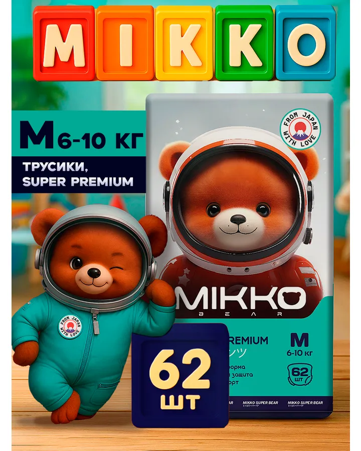 Трусики Mikko Bear Premium M (6-10 кг) 62 шт.Лично нам понравилист. Тоненькие, резиночка мягкая. Впитывают хорошо. По протечкам не знаю, не держу ребенка долго в одном подгузнике.