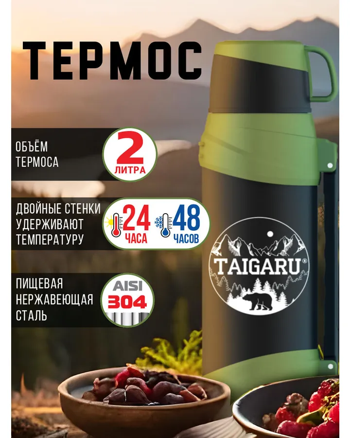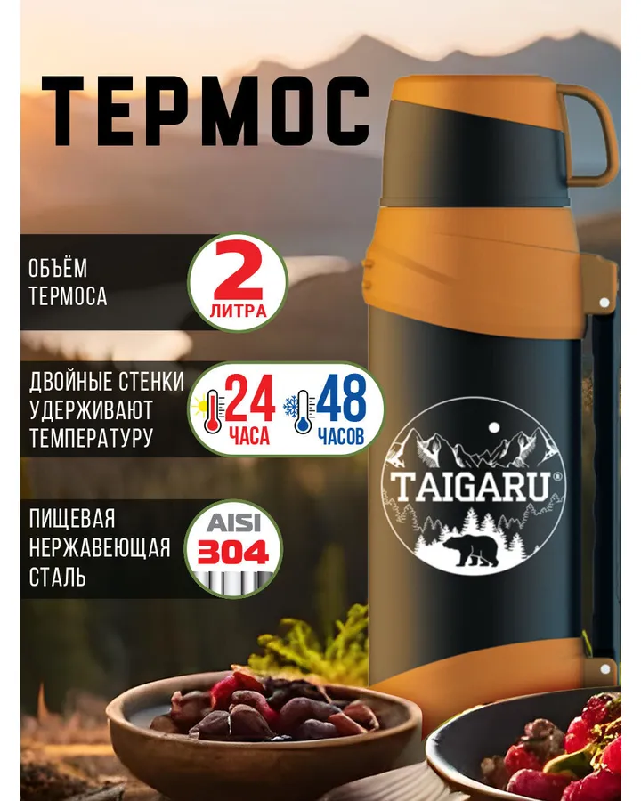 5Термос TAIGARU для чая и кофе 2 л широкое горло 2 кружки походный наборКлассный термос! Долго держит тепло и удобно носить. 👍