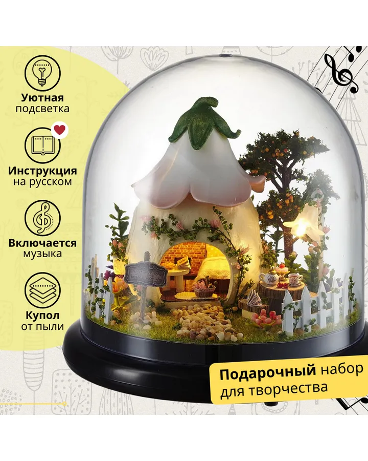 Конструктор Yarvita DIY House Сад МандрагорыХороший набор. Ребёнок 8 лет собирал сам. Очень понравилось всё. Детали такие маленькие,и всё вышло очень аккуратно,детально и красиво! Есть подсветка под крышкой . Выглядит сказочно!