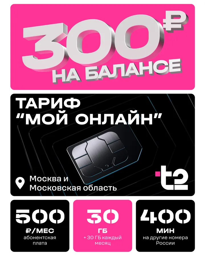 Sim-карта t2, тариф "Мой онлайн+", баланс - 300 рублей