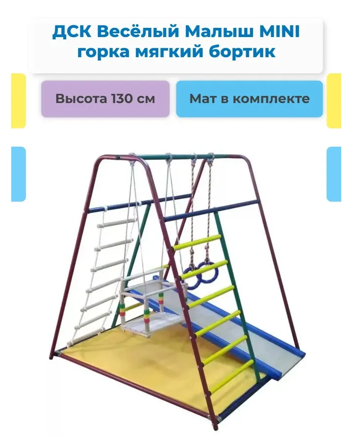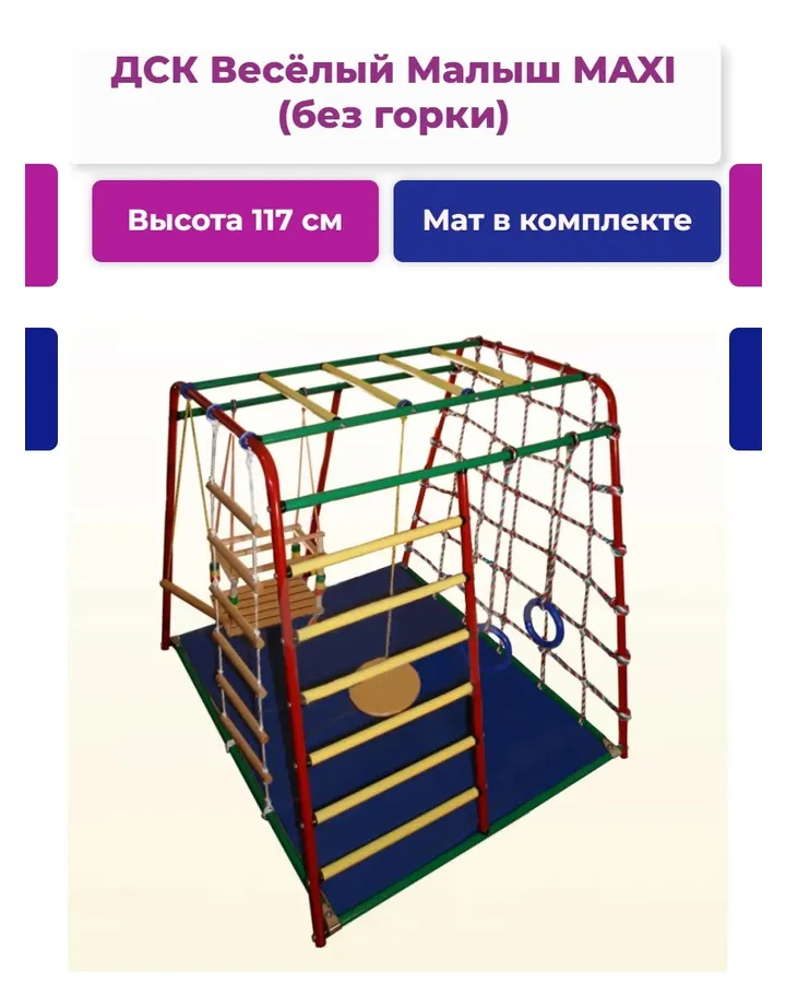 Классный спорт уголок для нашего малыша (сыну 2 года, подарили на д. р. 🙂) Качественные материалы, яркие краски, собирается быстро, все отверстия совпали. Сын осваивает вертикальный подъём, очень зашла горка, поднимается по ней и спускается и передом и задом 🙂 А благодаря тому что она легко снимается мы ставим её куда угодно (и к дивану и к его кроватке, он по ней с удовольствием поднимается и спускается). Рекомендую однозначно, товар превзошёл все мои ожидания.