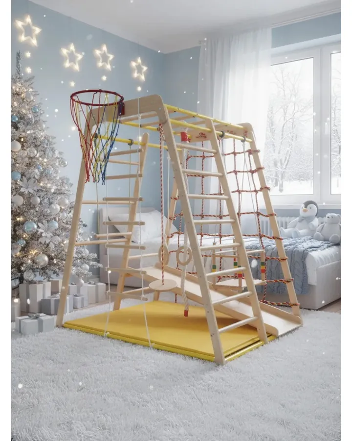 Классный спорт уголок для нашего малыша (сыну 2 года, подарили на д. р. 🙂) Качественные материалы, яркие краски, собирается быстро, все отверстия совпали. Сын осваивает вертикальный подъём, очень зашла горка, поднимается по ней и спускается и передом и задом 🙂 А благодаря тому что она легко снимается мы ставим её куда угодно (и к дивану и к его кроватке, он по ней с удовольствием поднимается и спускается). Рекомендую однозначно, товар превзошёл все мои ожидания.