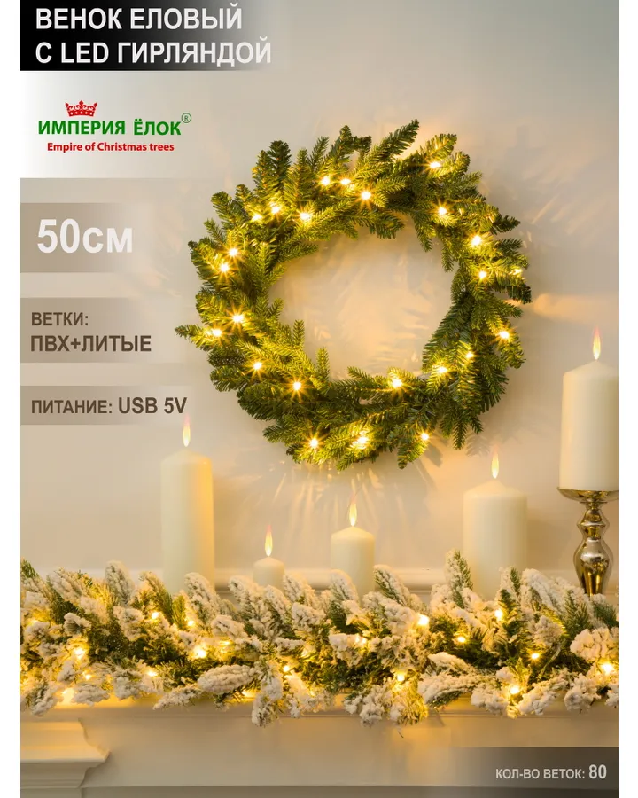 Венок еловый с LED гирляндой Империя Ёлок 50 см