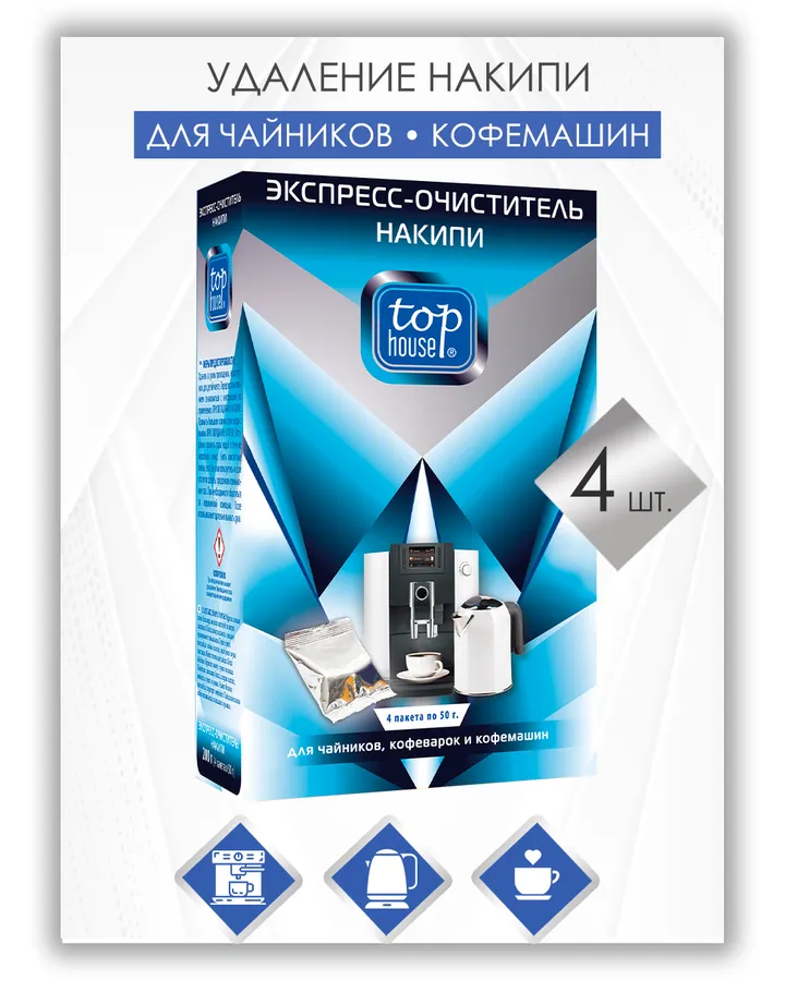 Моющее средство Top House 50 г от накипи 4 шт.Постоянно беру именно это средство для очистки кофемашины. С ним реже стал загораться индикатор очистки от накипи.