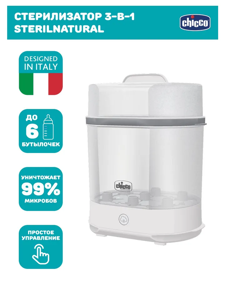 Стерилизатор ChiccoОчень довольна. Не надо стерилизовать по 2 бутылки, загружаю раз в день всё вмести с молокоотсосом, 5 минут и готово
