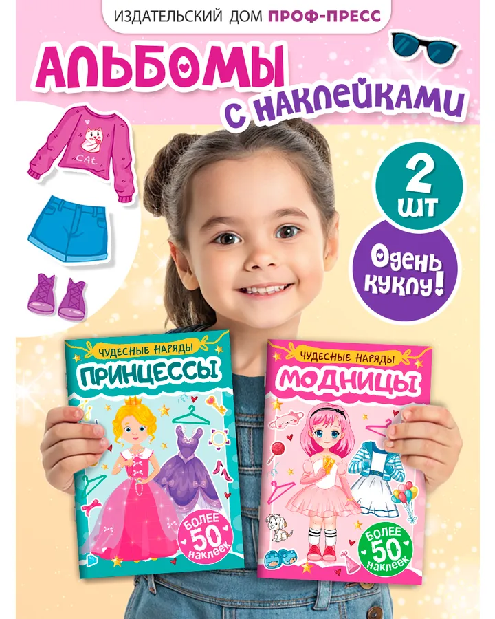 Книжка с наклейками Проф-Пресс для девочек. Чудесные наряды. Набор из 2 шт. Модницы+принцессы