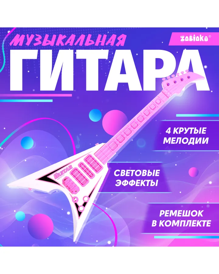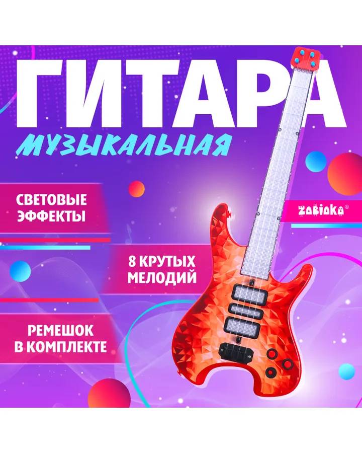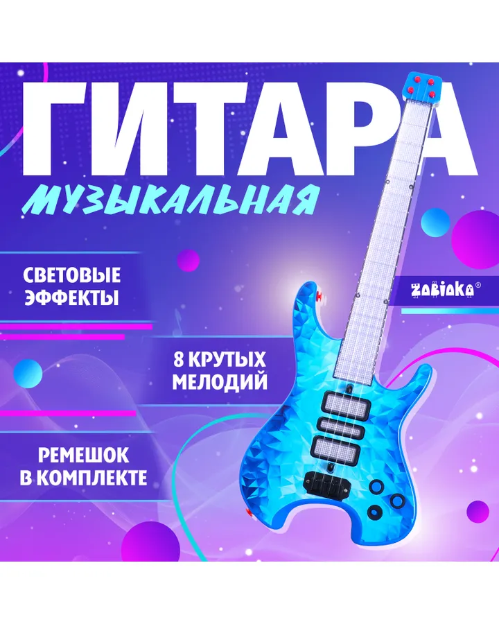Игрушка музыкальная Zabiaka гитараГитара пришла хорошо упакованная без повреждений. Выполнена качественно, однако нет болтика для крышки отсека с батарейка из-за этого иногда батарейки выпадывают. Играет громко, микрофон хороший с функцией эхо. Но не смогли включить заявленных 8 мелодий. Играет одна и та же мелодия постоянно. Инструкции по использованию нет, лишь название кнопок на самой коробке на этом все. Приходится изучать так скажем методом тыка.