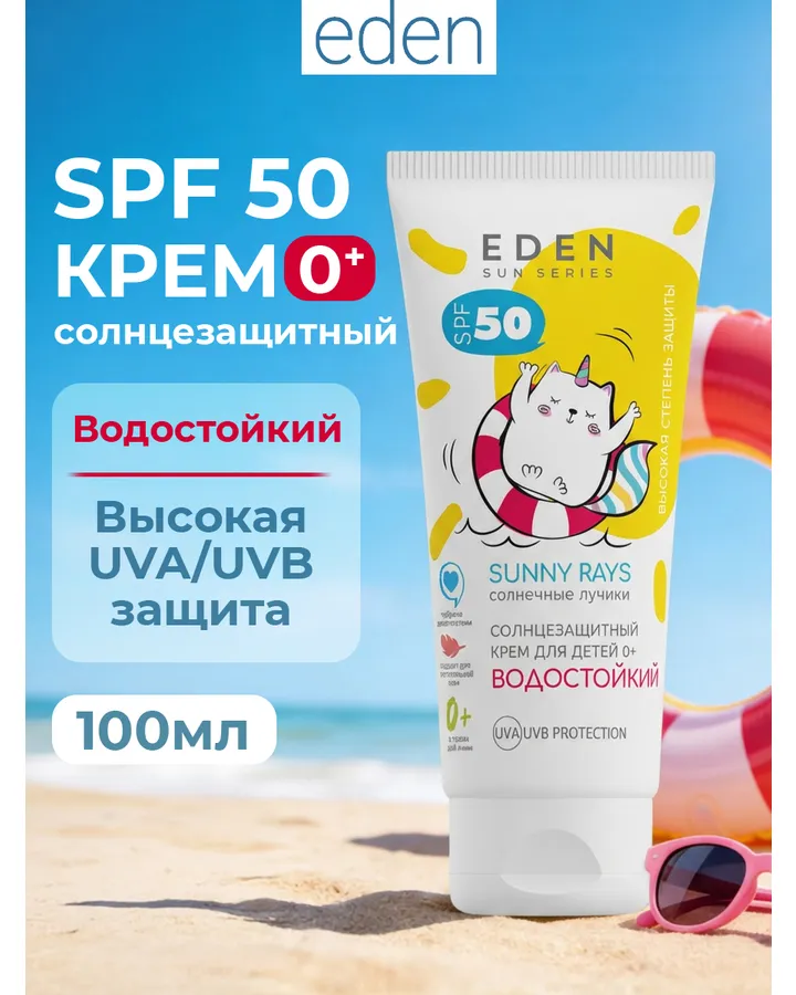 5Крем солнцезащитный водостойкий EDEN Sun Series для детей SPF50 100млСо своей задачей справляется