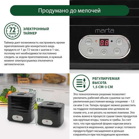 Дегидратор сушилка для овощей MARTA MT-FD1888C белый жемчугВместительная, 8 поддонов,, удобное регулирование Температуры и времени сушки.