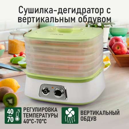 Дегидратор сушилка для овощей MARTA MT-FD1888C белый жемчугВместительная, 8 поддонов,, удобное регулирование Температуры и времени сушки.
