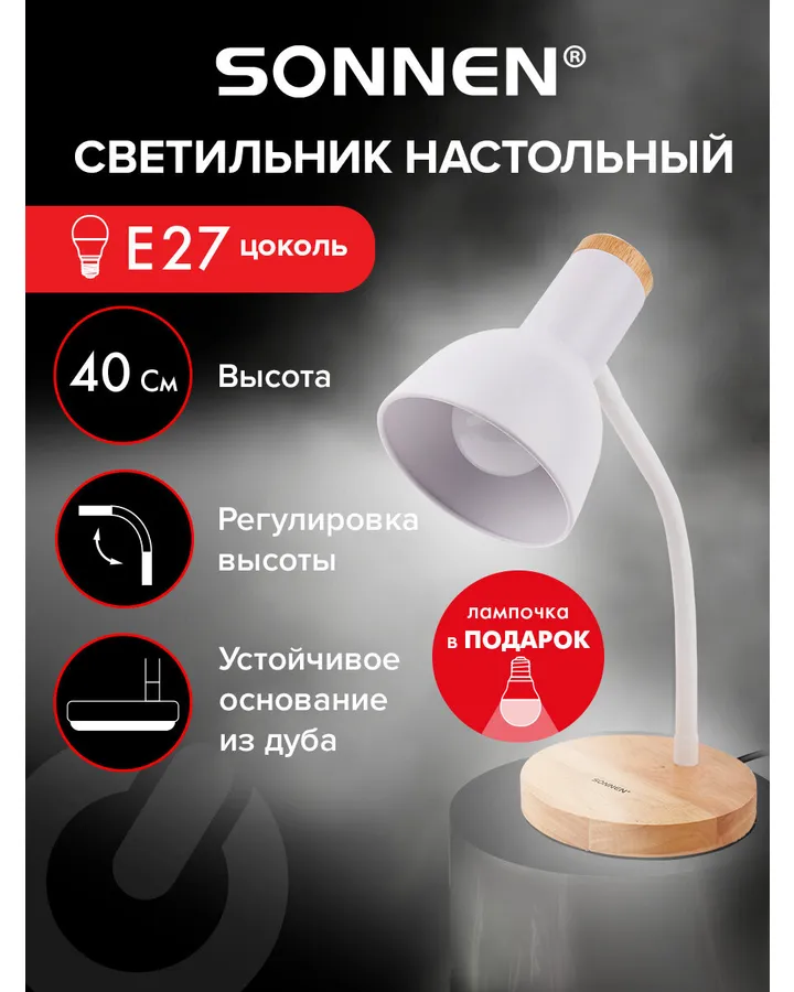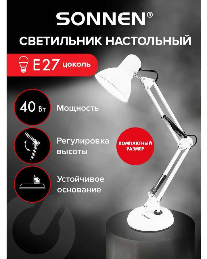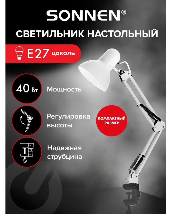 5Лампа настольная Sonnen светильник на рабочий стол с цоколем Е27 на струбцине 40 Вт высота 50 смОтличная лампа, супер удобно! Место на столе не занимает.