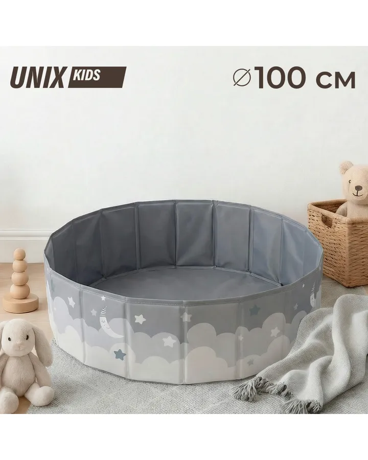 Сухой бассейн UNIX Kids GreyОтличный сухой бассейн! Купили к нему 500 шариков (400 d7и 100 d5), и дочка реально бултыхается в нём. Туда же добавили мягкие кубики и всякую ерунду, типа ленты и мячика, которые дочь ищет и гордо передает нам "добычу"