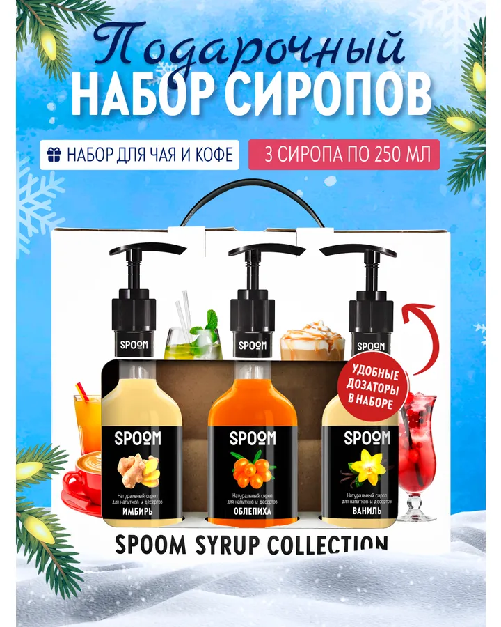 Набор сиропов SPOOM Имбирь Облепиха Ваниль для чая и кофе 3 шт по 250 мл и 3 помпы