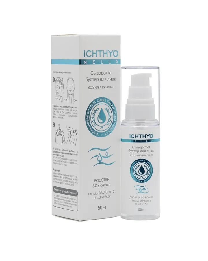 Сыворотка Ichthyonella SOS Увлажнение 50 млИспользую в комплексе всю серию. Средства друг друга дополняют. Сыворотка не пахнет, отлично распределяется, два нажима хватает на лицо, шею и декольте.