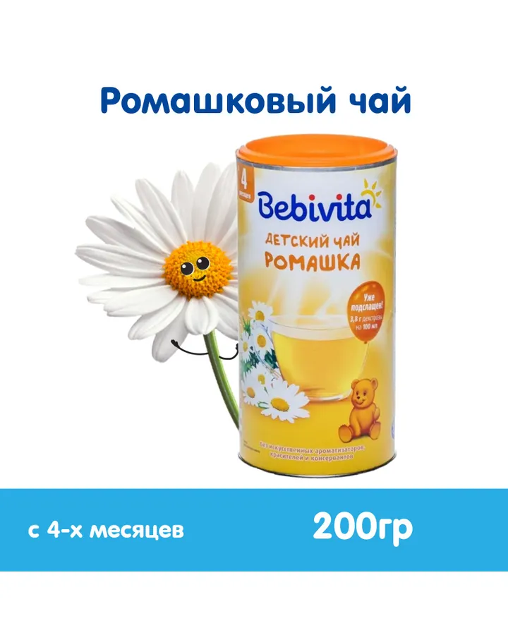 Чай Bebivita ромашка гранулированный 200г с 4 месяцевПопробовала и удивил, малыш отказывается от воды наотрез, чуть сластила воду, 2 с.л. и всё, попробовали и малыш с первого раза из 100мл выпил 70 с удовольствием, это супер, спасибо