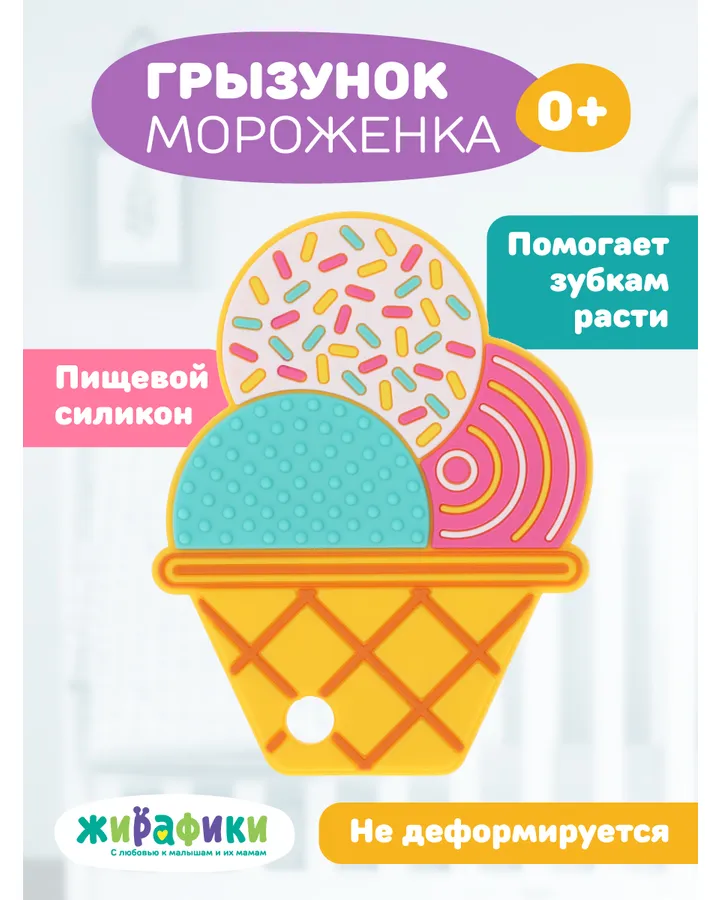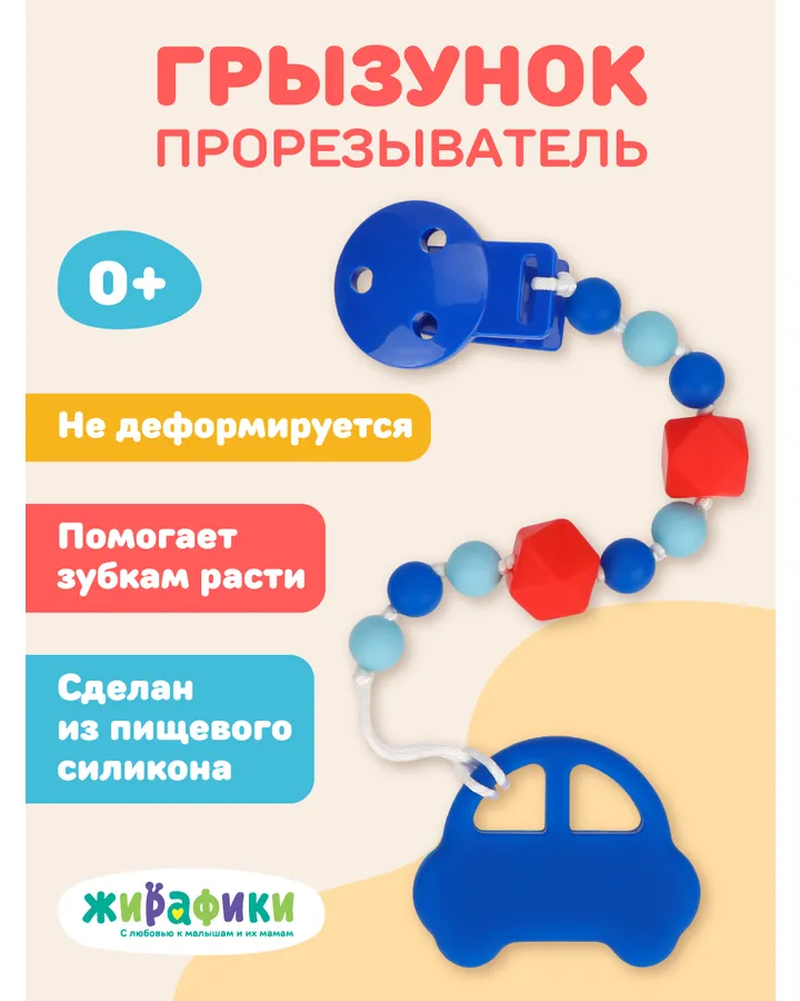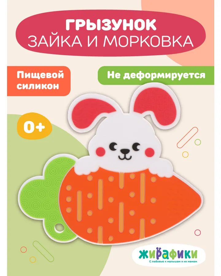 Прорезыватель Жирафики ЗайкаПокупали эту морковку для ребёнка с аутизмом под костюм зайчика на утренник. Думала сразу прогрызет и придётся выкидывать, т.к грызунок все таки рассчитан для малышей. Но нет, жуёт по сей день, уже три недели. На удивление оказался прочным. При этом он достаточно мягкий и приятно кусать. Ребёнка очень успокаивает, очень он полюбился сыночку моему. И в садик и в гости и дома- постоянно с ним. Перед сном сосёт ушки зайчику. Даже не ожидала что покупка окажется настолько удачной