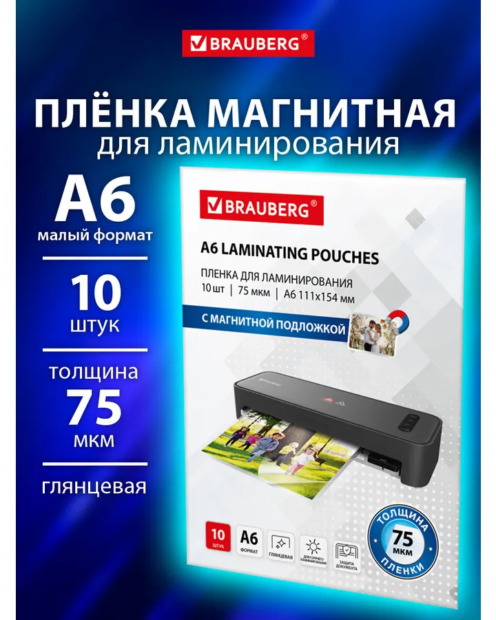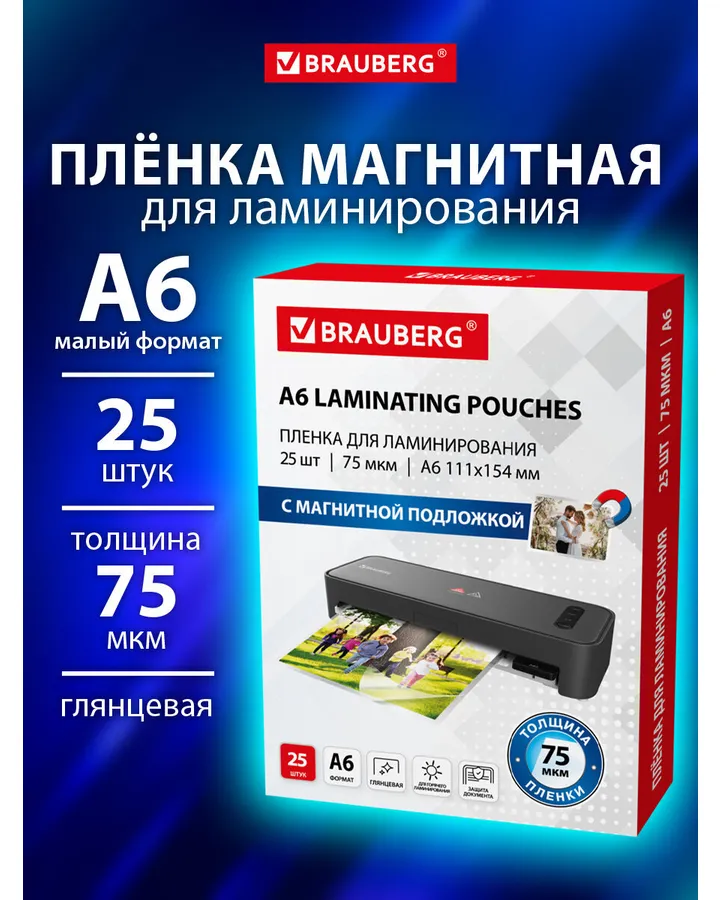 Пленка для ламинирования Brauberg А6 с магнитом для фото 25 штук 111x154 мм 75 мкм