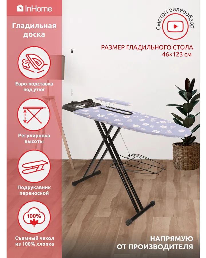 Гладильная доска InHome с розеткой и подставкой для утюга парогенератора