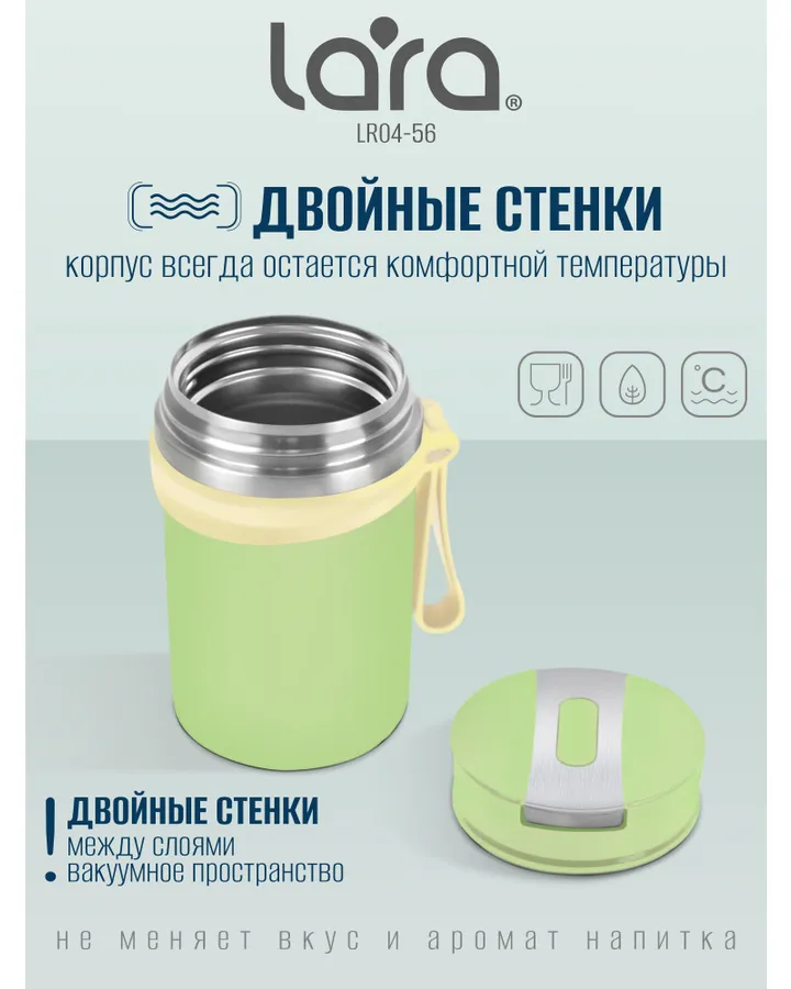 Термос LARA LR04-54 Beige 0.5 лХороший термос, заявленные функции выполняет. Держит тепло примерно 6ч. Купили специально, чтобы ребёнок кушал суп в школе.