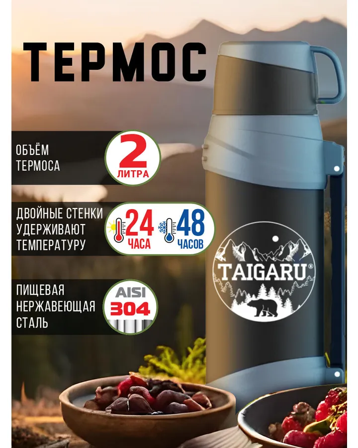 5Термос TAIGARU для чая и кофе 2 л широкое горло 2 кружки походный наборКлассный термос! Долго держит тепло и удобно носить. 👍