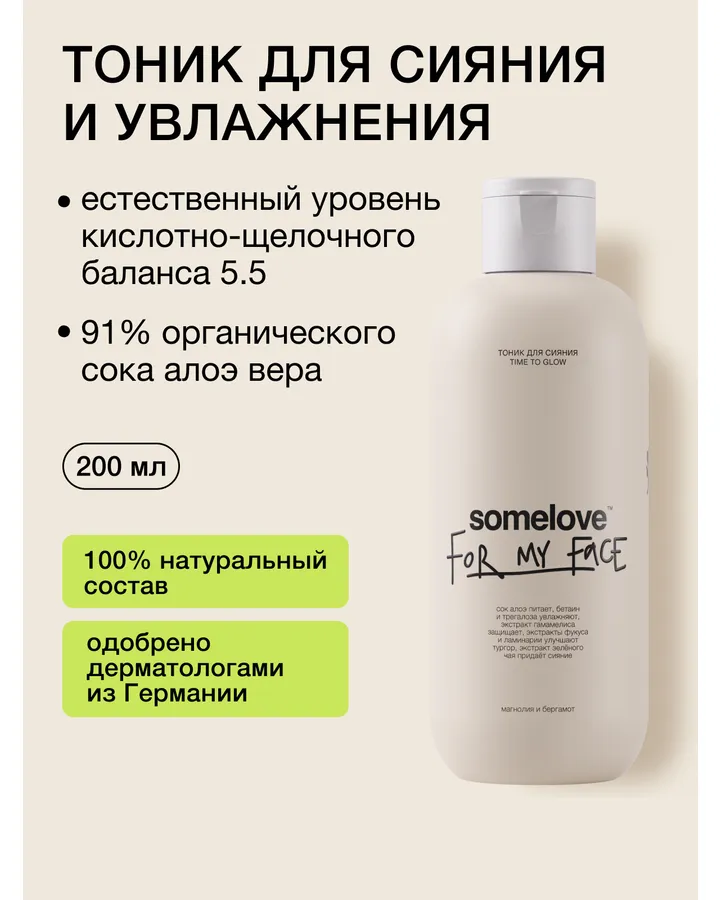 Тоник somelove «пора сиять» 200 мл 1 шт.Моей сухой чувствительной коже отлично подошел. Увлажняет, правда не липкий, с моей умывалкой, сыворотками и кремами сочетается.